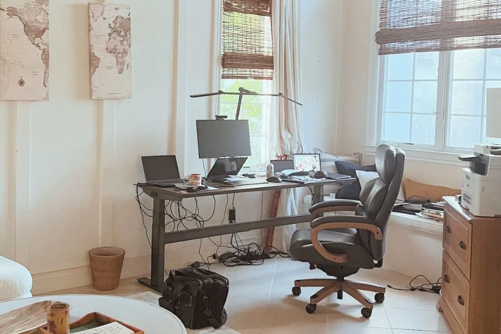 3 full workstations, 1 main office with desk, office chair, printer and display and 2 other desks in guest bedroom and common area.